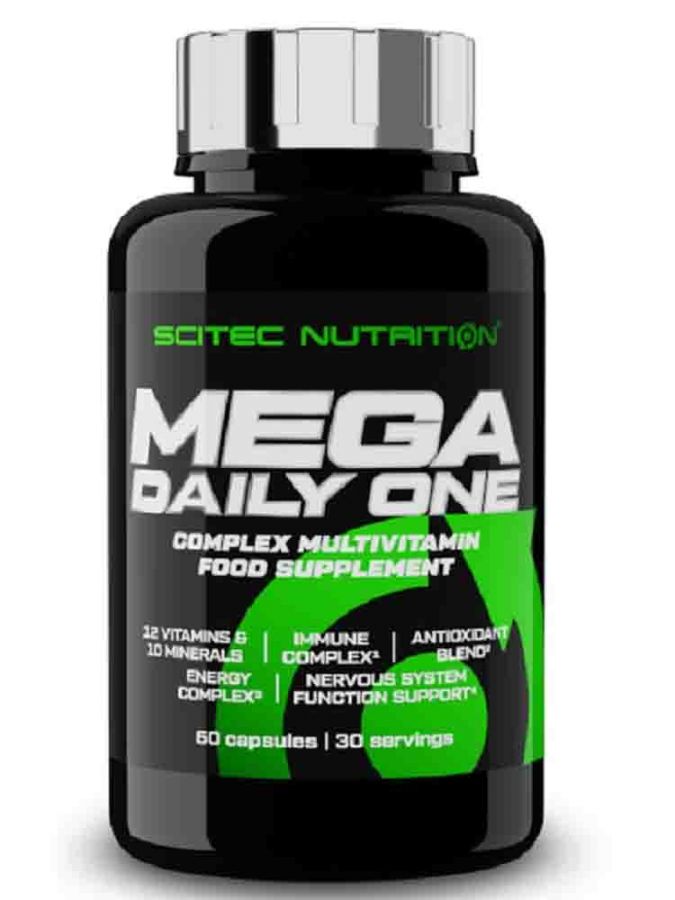 Scitec Nutrition Mega Daily One Plus - наши передовые мульти-витамины и минеральная формула с 25 ингредиентами! Он отличается очень высокой дозой комплекса Витаминов группы В и Витамина С, плюс в составе важнейшие минеральные вещества, включая Магний, Селен и Цинк. Витамин С способствует нормальной функции иммунной и нервной системы, а также уменьшению усталости. Он так же помогает поддерживать нормальную функцию иммунной системы во время и после интенсивных упражнений (эффект достигается при ежедневном приеме 200 мг в дополнение к рекомендуемой суточной дозе Витамина C). Витамин В2 способствует поддержанию нормального зрения и нормальных красных кровяных клеток. Фолиевая кислота способствует нормальному синтезу аминокислот.